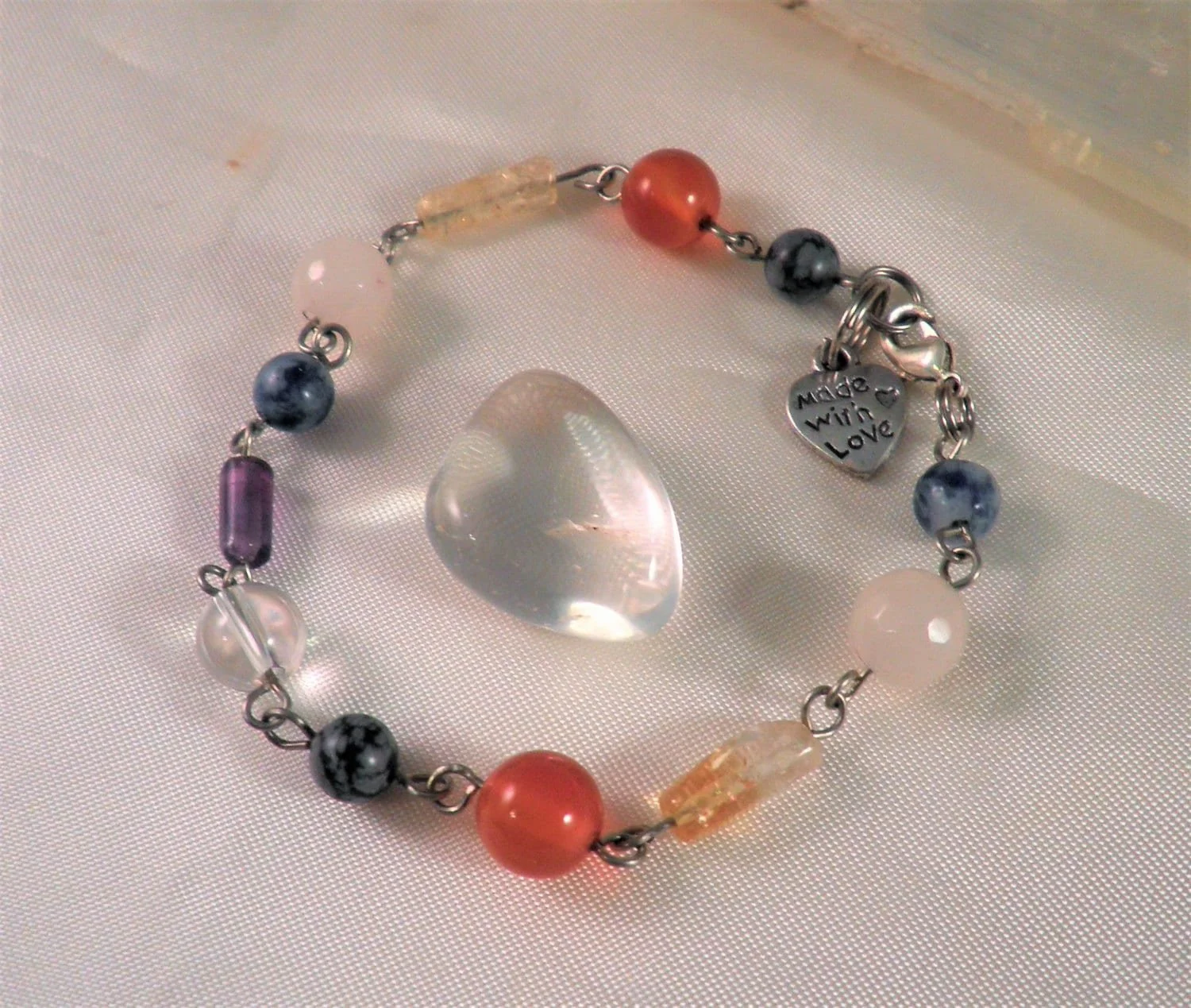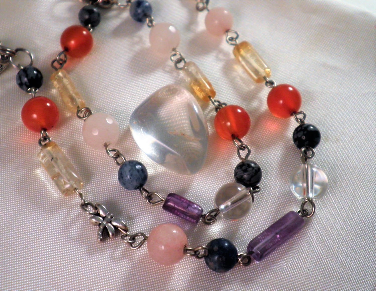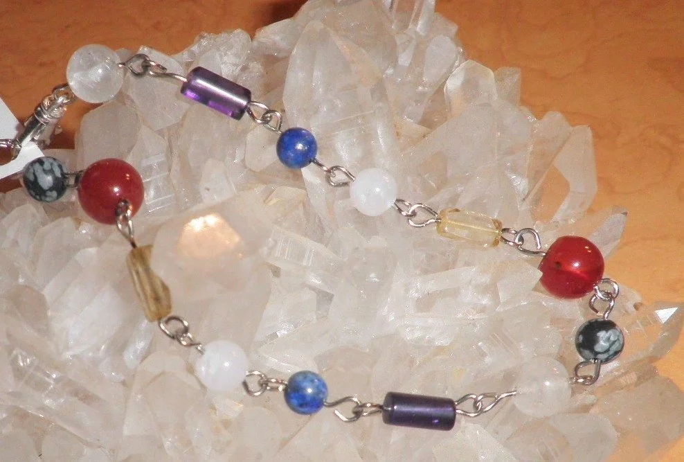 This energy piece is created with an eclectic blend of 6 & 8 mm round, rectangular and cylindrical genuine Gemstone beads of Snowflake Obsidian/ Carnelian/ Citrine/Rose Quartz/ Sodalite/ Amethyst/ and Clear Quartz